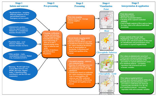 The processing of residential fire data for visualization and analysis of spatial fire data encompasses three different mapping methods (Stages 3 and 4 in Figure 3).
