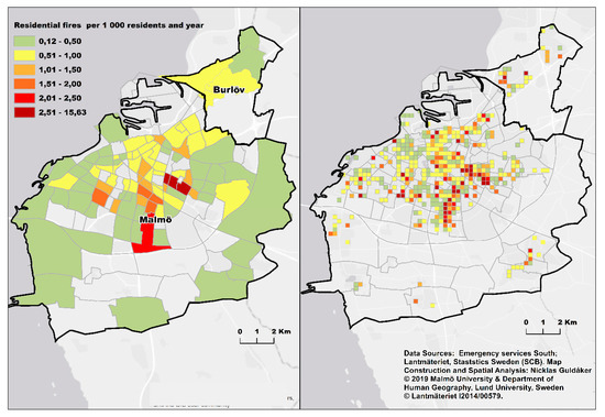 High or low values of residential fires in subareas of Malmö and Burlöv entail more or less fires relative to the population (Figure 5 and Figure 9). Notably, the average for Malmö and Burlöv is 0.76 residential fires per 1000 inhabitants, which is significantly higher than the average 0.49 for the metropolitan areas of Stockholm, Gothenburg and Malmö together. The highest value in Sweden, 6.1 residential fires per 1000 inhabitants during 2007–2015, is found in a subarea within Malmö called Rosengård, a district badly affected by intentional fire setting both outside and inside buildings [9]. As mentioned in Section 3, it should also be emphasized that the number of intentional fires in Malmö has decreased considerably during the period 2008–2015 [32]. The normalization of residential fires per 1000 inhabitants is an essential first stage in the analysis because determining factors other than population density may correlate to the spatial distribution of residential fires. The subarea level is advantageous for further geo-statistical analysis owing to a rich and partly open access to other data, such as socio-economic variables at the same geographic level. The subarea level has been used in several geo-statistical analyses of intentional and residential fires and underlying factors in Malmö, Stockholm and Gothenburg [9,36].