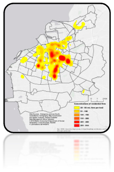 Geographical visualizations of urban fire incidents are relatively common in scientific contexts [3,4,5]. Spatial techniques are also widely used to visualize and analyze crimes, fires or other incidents over a specific urban area [6,7]. The aims with these spatial methods can vary, but the spatial dimension often gives the user an opportunity to reveal possible spatial patterns of incidents. Such information can be used for both theoretical and practical purposes, such as risk modeling, linking to socio-economic variables, theorizing causes of crimes and fires and developing hypotheses and approaches. These techniques can also be applied to analyze specific types of fire incidents on different geographical scales and in various areas.