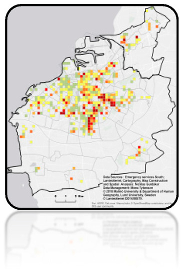The interpretations and proposals for using these different geovisualization techniques in fire prevention are partly based on results and feedback from workshops with staff from emergency services in the three largest metropolitan areas in Sweden, and partly on results from the use of techniques and methods in research [32,36]. In total, four workshops have been held with 32 employees from Emergency Services South (Malmö), Emergency Services Stockholm, Emergency Services Södertörn (Stockholm) and Emergency Services Gothenburg. Participants in the workshops were analysts, statisticians, fire engineers, fire inspectors, chief fire officers, commanders, fire safety officers and area managers. The overall purpose of the workshops was to present, discuss and get feedback on different GIS-based and geo-statistical analyzes of residential fires within each emergency services area. The process during the workshops was that the various map visualizations were presented to the personnel from the emergency services. All participants were then given the opportunity to comment on and problematize both maps and the spatial distribution of fires within their areas of operation (e.g., districts within Malmö, Stockholm and Gothenburg). All comments were compiled into a document that was further used as input to the evaluation of strengths and weaknesses with the various geovisualization techniques and their specific applicability in the emergency service’s fire prevention work. The results of the presented geovisualization methods in this paper are based on all workshops and largely applicable to all three metropolitan areas. In order to not repeat presentations from all workshops, this paper only presents data and visualizations of the municipalities of Malmö and Burlöv.