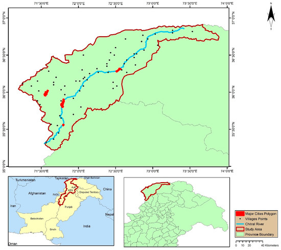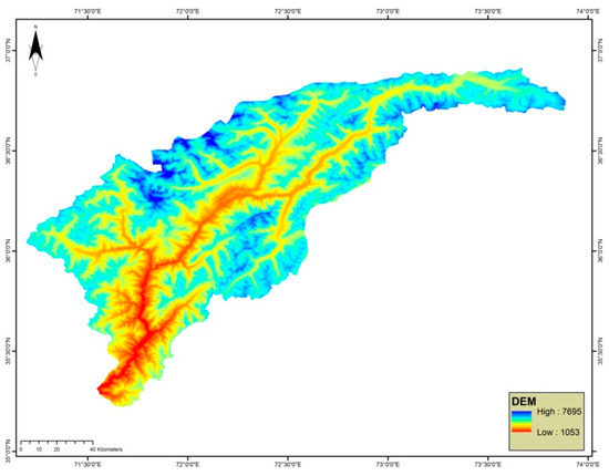 The Chitral River is a 480km long tributary of the Kabul River, which is, in turn, a subordinate of the River Indus, located in the Khyber Pakhtunkhwa province of Pakistan. It is located in eastern Afghanistan and northern Khyber Pakhtunkhwa. The Chitral River is situated between 35°50’46’’ N and 71°47’09’’ E. Figure 1 shows the map of the Chitral District. Different valleys of the district merge together to form 36 tributaries; the Chitral River is a combination of these tributaries. The Digital Elevation Model (DEM) (Figure 2) shows, in the map, that it is a highly elevated area with the highest elevation (7965m). From the extreme north in Baroghil—the Chitral River starts from the Chiantar glacier and re-enters Warsak in Peshawar Valley before entering Afghanistan in the Kunar province, and traverses a 496 km distance. The highest peak of the Hindukush Mountains, Tirch Mir, the surrounding glaciers form the second major tributary of the river. Hindu Kush Mountain’s snow and melting glaciers feed the river system, so its flow remains throughout the year. The Warsak Dam is located 30km west of Peshawar, having a maximum output of 250,000 K-Watts, and was constructed on the Chitral River for irrigation and hydropower generation purposes. The Dam is suffering from silting issues. Due to silting, its reservoir almost became full. Now, the power generation capacity of the Dam has dropped to 64,000–20,000 kW throughout summer and winter seasons, correspondingly.