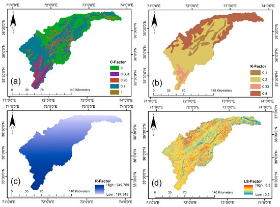 There are various types of land cover; different values of C-factor are assigned to those land covers according to their condition. The different C-factor values are represented in the map and their spatial distribution. The values of the C-factor are given according to the different types of land use. For bare area 1, for natural shrubs, the value is 0.70, for the crop in flood plain, 0.28, and 0.004 for the forest, as shown in Figure 4a. Higher values of the C-factor show more vulnerability to erosion. In general, the rate of soil erosion decreases with more vegetation by providing a barrier to eroded soil. It improves the physical and chemical properties of soil and maintains the coarseness of the surface of the soil. Table 1 represents the values in between 0.004 to 1; high values of the C-factor show that area is more susceptible to soil loss.