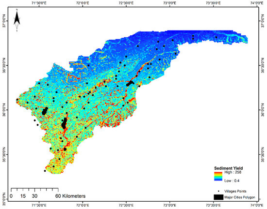The quantity of soil eroded from the reservoir due to rainfall is termed as sediment yield. The areas with a steep slope, scrubland, and sandy soil have the highest sediment yield, as shown in the map. Figure 5 shows the capacity of sediment yield in the Chitral district. The map shows that these areas have as high sediment yields as 258 tons/ha/year. In the downward portion of the study area, there is more sediment yield while the northwestern portion shows the low sediment yield.