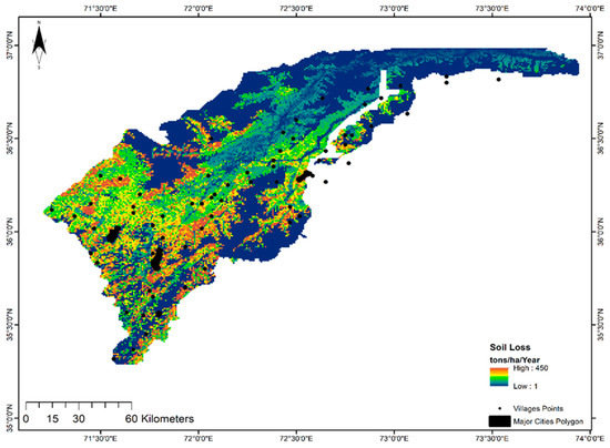 To mitigate any challenging situation, risk mapping is considered a basic step. Erosion models are basic tools that will be helpful in future planning of soil conservation [14]. GIS and remote sensing technology are considered as the most powerful tools to measure metrological and biophysical constraints at variant spatial scales [17]. It is not possible to calculate the soil loss by using conventional methods due to the high cost, and because they are time consuming [18]. Therefore, the Revised Universal Soil Loss Equation (RUSLE) model is most widely used because it is simple, easy, and requires fewer data and time. The integration of the RUSLE model with GIS and remote sensing data generate more accurate results [6]. This model can easily be implemented, and required data are easily available for most countries. The results generated from this study will be useful to overcome mismanagement issues and well-grounded measures should be taken to control soil loss in areas with higher soil erosion rates [19,20].