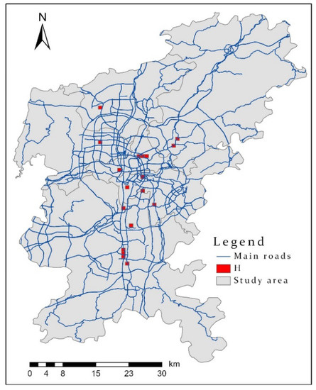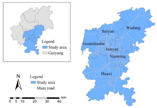 Guiyang vector map data and administrative divisions were from the National Catalogue Service for Geographic Information [36]. The road network data was taken from Open Street Map (OSM), which includes motorways, trunk roads, primary roads, secondary roads, and branch roads. The length of the road was calculated using ArcGIS Pro 2.4.0.