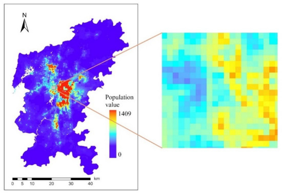 The population density data were obtained from the WorldPop [31] data set, which is an open spatial demographic data platform [32]. This data set provides the annual population density raster data of all countries in 2000–2020, with an accuracy of 3 arc (approximately 100 m), and the unit is the total population per pixel. WorldPop population data provides strong support in the field of spatial population related research, and its accuracy is remarkably improved compared with traditional methods [33]. In this study, the original population raster data of China in 2016 were used, and the missing values were filled on the basis of the adjacent grid values. The average value of cells in each grid was calculated as the grid population data. Figure 2 shows the WorldPop population raster data.