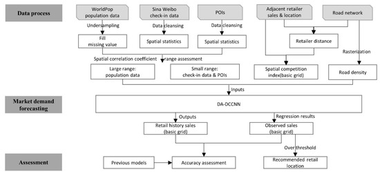 In the study of the issues of retail site selection, competition degree [37] and market potential [38] are important evaluation indexes. However, considering only the competition degree of the business area factor may ignore the difference in the actual business situation of many stores. Moreover, the accurate assessment of the regional sales level may be affected by the difference of the range continuity in the spatial distribution of crowdsourced spatiotemporal data. Therefore, this study proposes a spatial competition model based on actual sales data and analyzes the spatial correlation range of crowdsourced data. On this basis, we constructed the DA-DCCNN model, which represents the relationship between the factors of site selection and market demand, and finally recommended 18 retail sites. Figure 3 shows the framework of the proposed method.