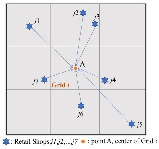 As shown in Figure 5, Point A is the center point of grid i, and j1–j7 are the retail stores located in the eight adjacent grids of grid i. The straight line with the arrow indicates the Euclidean distance between the center point of the grid and the adjacent grid stores. The spatial competition index of the grid i can be calculated by Equation (4).