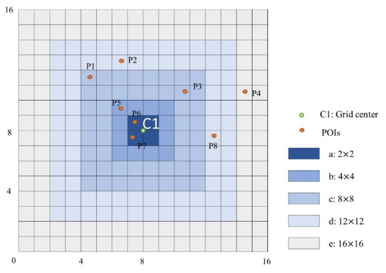 As shown in Figure 6, the base grid is divided into cells. C1 is the center point of the basic grid, P1–P8 represent the POIs; a–e represent the area of a grid, and the ring grid area of , , , and , respectively. The evaluation steps of the range of feature spatial correlation are as follows.