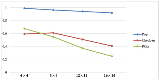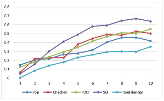 According to the definition in Section 3.2.2, the calculation results of the spatial correlation coefficient of the features are shown in Figure 9, where the x-coordinate is the ring grid with different sizes, and the y-coordinate is the PCC between the spatial statistics of feature area a (Figure 6) and the spatial statistics of the grid of x-coordinate size (Equation (5)). As shown in Figure 9, the population data still have a strong spatial correlation coefficient even in a large range. However, given the limitation of population mobility and radiation range, the spatial correlation coefficient between check-in data and POI gradually decreases with the increase of distance, and only has a strong spatial correlation in a small range.