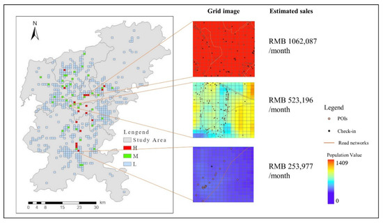 In this study, was selected as the size of the basic grid, and was set to 0.32. The study area was divided into 4302 grids of . A total of 515 grids have retail stores, which is the experimental data set. Among the remaining 3785 grids, many have no shops but have a dense population, Sina Weibo check-ins, and POIs, and thus have market potential. In particular, 569 grids have POIs and Sina Weibo check-in data.
