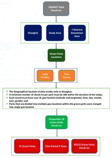 We also collected population data from the census of Shanghai [] on the districts in the study area, as presented in Table 2. Figure 2 represents the criteria that we deployed for collecting the check-ins.