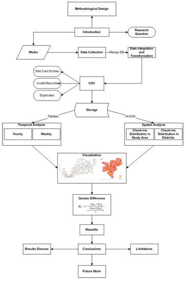 The kernel density estimation (KDE) method was used to model geolocation data spatially and offers an additional particular and comfortable structure for spatial estimation of density. The method was used for the assessment of environmental attributes—for example, healthcare properties [], the diet environment [], and green space advantages. It boosts access or measuring distance by transforming point data into something similar to a nonstop surface and allowing the density of the characteristic to be measured at any point on the map’s surface []. In this research, we expected to examine the effects on visitation rates of users’ check-in behaviors to green spaces. We utilized a sample of data to research green park-related check-in behaviors, including likes and dislikes, as a summary of the behavior or preferences of the general public in various activities while using park resources. Similarly, the aim of the study is to address the following questions: (i) Is using the social media network dataset feasible for this kind of environmental studies? (ii) How often does the time of day influence the behavior of the general public in green parks? (iii) Which district is the center of activities in the city center of Shanghai? To properly grasp the link between green parks and visitor behavior, we analyzed users’ spatiotemporal trends in urban green spaces using a large-scale dataset from July 2014 to June 2017, with almost 70,000 check-ins. Our main results indicate the user check-in distribution in different green parks and exciting behavioral changes based on the time of day in 24 hours and the day of the week. We also investigated the gender difference among districts and days by applying the relative difference formula. By examining these factors, we could analyze the use of urban green parks and its variance across a range of temporal scales. This method of capturing visitor activity in urban green spaces is an attempt to solve the drawbacks of previous studies. This method paves the way for socioecological research using crowdsourced and social network data instead of relying on the results of subjective coverage and observational data.