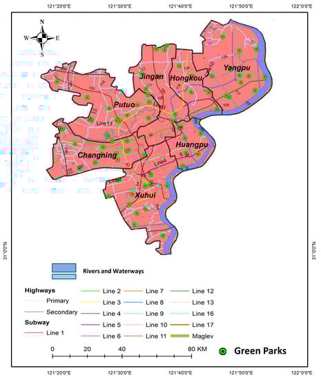 In 2016, Shanghai was divided into 16 districts: 15 districts (Baoshan, Changning, Fengxian, Hongkou, Huangpu, Jiading, Jing’an, Jinshan, Minhang, Pudong New District, Putuo, Qingpu, Songjiang, Xuhui, and Yangpu) and 1 county (Chongming) []. Seven regions (Changning, Hongkou, Huangpu, Jing’an, Putuo, Xuhui, and Yangpu) are located in Puxi (literally Huangpu West) and are known as Shanghai’s downtown or city center [,].