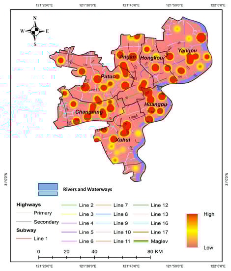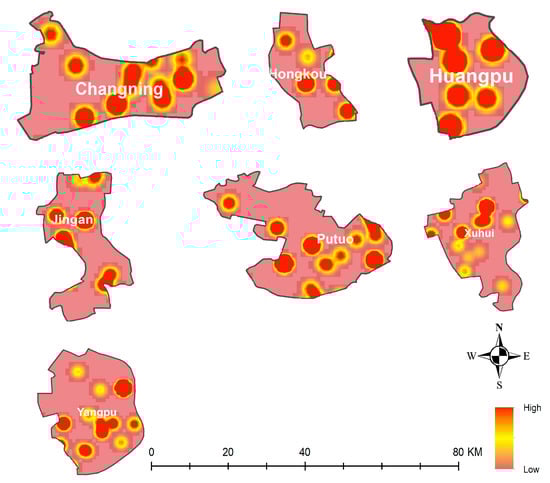 We utilized KDE to examine the spatial distribution of check-in data and ArcGIS for visualization to investigate the Weibo geolocation check-in data. Figure 7 indicates the overall check-in density between July 2014 and June 2017. The red spots show higher human density, higher levels of activity, and a higher percentage of social media usage. It is unsurprising that the green parks in Putuo District have large clusters of activities.