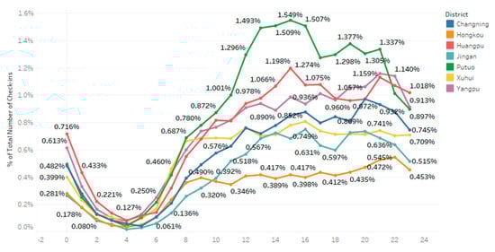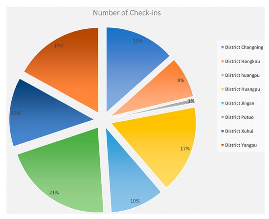 Figure 10 shows the district percentage for the three-year check-in dataset in the downtown area of Shanghai, revealing the differences in the check-in behavior of users in different districts. The number of check-ins in Putuo and Huangpu were really high compared to other districts, which makes Putuo District famous for visitors, which is why the density was high in this district compared to others. The reason for this is that Putuo District is larger in area, and population is also higher than other districts, which is why Putuo District is denser than others.