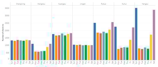 Figure 8 presents the overall check-in density in all the districts, which has been divided into seven. Our results show that the most check-ins were found in Putuo, Huangpu, and Yangpu Districts.
