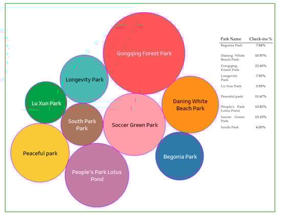 This result indicates that Shanghai’s green parks are fast becoming popular recreational destinations for the people of Shanghai. Figure 12 shows the most popular parks in our study area based on the number of check-ins. Mostly people visit these parks in the city center and share their experience by posting on Weibo. Table 4 also represents the number of check-ins in famous parks.