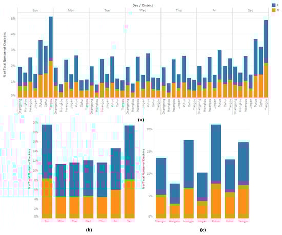 We investigated gender (male and female) data in Shanghai to explore the check-in numbers and behavior. A comparison of male and female user check-ins in days of the week, as well as in districts, examines the difference between male and female visitors in Shanghai. We used the relative difference (dr) [,] to estimate the gender differences in Shanghai districts and also for days of the week. It is frequently used as a quantitative indicator of superiority control and quality guarantee and is stated as follows: