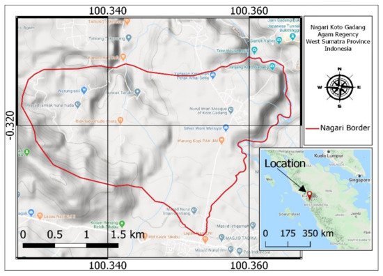 This research was conducted in the customary village of Minangkabau Koto Gadang in the Agam Regency, West Sumatra Province, Indonesia. According to [16], Minangkabau is “a cultural and geographical entity embracing the matrilineal kinship system with the descendant line taken from the women’s side of a family”. Koto Gadang is located on a hilly plateau and is partially restricted by the Sianok Canyon, which is West Sumatra’s leading tourist destination. The village consists of three Jorong—Koto Gadang, Sutijo, and Gantiang. Koto Gadang is located between the Hill of Kapanehan, Mount Singgalang, and Mount Merapi with an altitude reaching 920–950 m above sea level. The average temperature in this village is around 20 °C, while at night, it reaches 10 °C [32]. This is a strategic area directly adjacent to the Bukittinggi Tourism City and has a population of 2697 people, as well as 878 houses, 79 MSMEs, nine mosques, five offices, three schools, and two health service centers. The village has electricity and internet facilities, as well as the potential for land-use change and economic growth in the future [33].