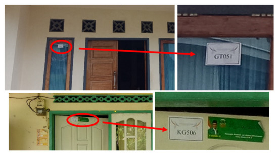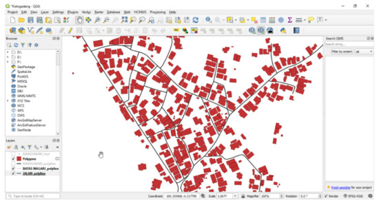 Several data were collected to build the database. For example, building attribute data were collected directly by visiting existing buildings with the assistance of 30 students from the department of civil engineering and information systems of Andalas University. Meanwhile, spatial data for the buildings were collected using high-resolution village aerial photographs, Unmanned Aerial Vehicles (UAVs), or drones—in this case, DJI Phantom 4. According to [26], a 1:1000 scale village mapping using drones is very appropriate, as this method can produce accurate maps with high accuracy of less than 0.20 m. Detailed information is shown in [37]. The images produced were combined using Agisoft Photoscan and registered using ten ground control points, after which a digitization process was conducted to build the maps. The spatial data produced from digitizing the images in polygon data types were then imported into the PostgreSQL/PostGIS database.
