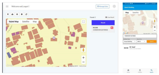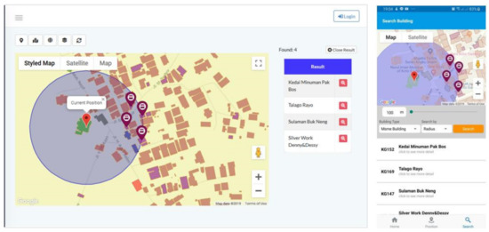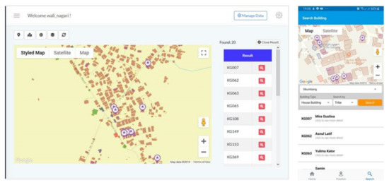 The suitability of the GB for the needs of the village officers was tested, and the following pictures show that it is suitable. For example, Figure 13 shows the results of the search for a resident’s house using an identification (ID) number of 1306051234560002 (dummy data). Figure 14 shows the search results based on the owner’s tribe in Sikumbang. In addition to the use of an ID number and the tribe to search for buildings, the village officers were authorized to collect data on residents, residential buildings, and other existing buildings, as well as add to or update the master data for the buildings, including the MSME buildings.