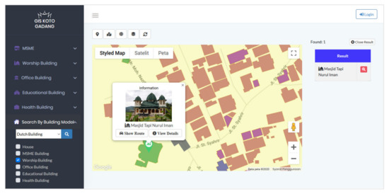 The GB was created to improve the quality of life of rural communities. The GB also acts as a cyber-based system with an information infrastructure for village governance and economic activities. GB functions that support smart village activities include searching for (1) buildings (MSMEs, offices, mosques, schools, health centers, and houses), including information and routes to the location of the buildings, and (2) tourist attractions in the form of historical Dutch buildings and other tourism supporting industries, such as restaurants, embroidery, and silver handicraft MSMEs. This GB is an expansion of the GB developed in [16,20,21]. The authors in [20] analyzed the data needed for developing villages, including settlements, drinking water, health centers, and roads. The authors in [21] created a spatial database of buildings and their inhabitants. The authors in [16] established a land, building, and occupant information system that is in accordance with Minangkabau’s customary rules regarding land and building ownership. Expansion is being carried out for the GB in the form of the creation of new functions for building management based on the use of the building, while, at the same time, supporting the tourism of Koto Gadang village. The applications of the buildings include the use of buildings for MSMEs, offices, mosques, schools, health centers, and houses. This GB has demonstrated its ability to assist the village officers in carrying out several village government services and supporting the village tourism industry.