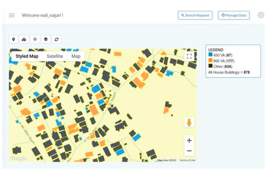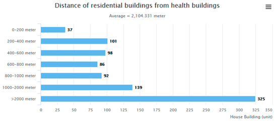 Using the data collected and stored in the database, various conditions in the Koto Gadang village community in terms of electricity usage, clean water, income, and the condition of people’s homes can be accessed by the village head. These data can be used for various purposes, such as village development planning, information on the average distance between houses, and a variety of needed public facilities. GB can produce graphs of the required information, as illustrated in Figure 16. From Figure 16, it can be seen that the average distance from a resident’s house to a healthcare facility is 2104 m, which is quite far. This distance calculation uses the PostGIS spatial function command, ST_Distance. ST_Distance calculates the distance of a straight line between two coordinate points. In addition, existing data can also be used to channel aid to communities affected by the COVID-19 outbreak. The government has decided to exempt electricity charges for people whose homes use 450 VA of electricity and give a 50% discount on electricity fees for those who use 900 VA of electricity. The GB that was created can display a map of the distribution of people’s homes based on the use of electricity, as shown in Figure 17. Data on the electricity usage of each house is stored in the building table. These data are grouped based on electricity usage (i.e., 450 VA, 900 VA, etc.).