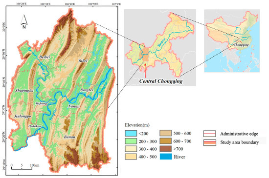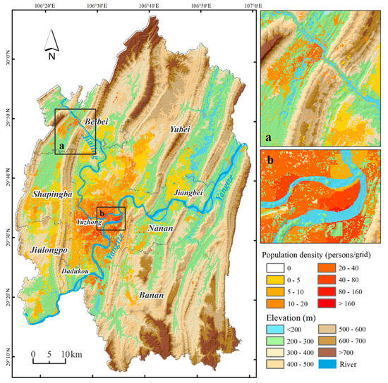 The central urban areas in Chongqing are famous for their mountainous and watery landscapes [35]. The average elevation is over 391 meters, with approximately 22.9% of the land covered by hills and mountains. Chongqing is also at the confluence of the Yangtze River and Jialing River. Its topographic features are extremely complicated. The region is in the subtropical monsoon climate with large seasonal variations in precipitation and temperature [36]. The relatively complex natural environment results in different levels of economic development and a heterogeneous population distribution, making Chongqing a typical place to research gridded populations.
