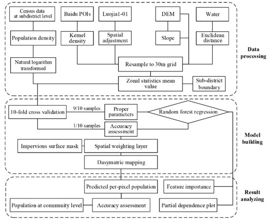 The multisource geospatial data were input into the dasymetric model due to the spatial heterogeneity of population distributions. To produce the spatial weighting layer, 10-fold cross validation was adopted to build a random forest regression model. Figure 2 represented the procedures for gridded population mapping, including the data processing, model building and result analysis.