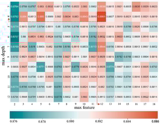 In the process of machine learning, it is necessary to optimize the super parameters and select a group of optimal super parameters for the learners to improve the performance and effect of learning [44,45]. For example, the max number of features and the max depth of trees are the two super parameters in random forest model. Grid search is conducted to try every possibility through loop traversal in all candidate parameter selections. The best parameters are used in the later analysis. To improve the predictive accuracy and control overfitting, the maximum depth and features of the decision tree were applied to stop excessive splitting. Moreover, the assessment accuracy is sensitive to the number of decision trees. If the number of trees is too small, it is easy to underfit the model. Conversely, more decision trees are likely to increase the calculation load. At the proper number, the model reaches a near steady state.