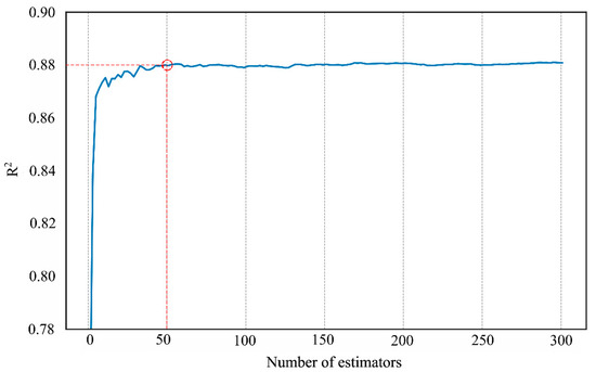 The suitable number of estimators was tested in the random forest and it ranged from 1 to 300. When the number of estimators reached 50, the accuracy of the model was 88% (Figure 4). After that, the accuracy was stable with small fluctuations. Therefore, 50 trees were sufficient in the random forest regression model. The max depth of the decision trees and the max number of features were 4 and 12, respectively, when the final tuning parameters were adopted.