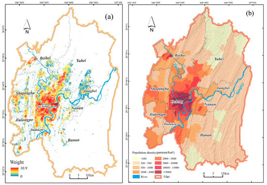 (a) Distribution weights of the population at a 30 m spatial resolution and (b) census population at the subdistrict level in central Chongqing.