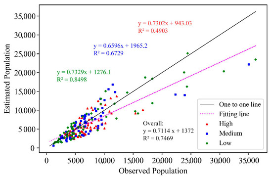 To estimate the prediction precision in communities with different population densities, all the communities were divided into three groups according to the density of the community’s population. In Figure 7, the green plus markers indicated the communities with low population densities below 150 persons per hectare. It is worth mentioning that the coefficient of determination (R2) of this group was 0.8498, demonstrating the high accuracy of the results. The R2 of the communities with medium population densities from 150 to 300 persons per hectare (the blue square markers) was 0.6729 and the R2 of the communities with population densities above 300 persons per hectare (the red triangle markers) was 0.4903. For all the communities, the overall accuracy was acceptable (R2 = 0.7469).