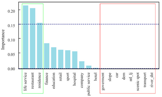 As marked in the green box in Figure 8, the densities of life service, restaurant and residence POIs were the top 3 most important features. Their importance values exceeded 0.15, reflecting that the model had learned to take advantage of those POI data. The density of life service POIs, such as post offices and barbershops, was the most important feature influencing the population mapping and had the highest feature importance score. Restaurants and residences were also of vital significance for everyday life and so they were closely related to population distribution. The feature importance values below 0.01 were shown in the red box. When the density of government POIs was high, it was usually the administrative office land in the city, corresponding to small populations. When the densities of car, transport and scenic spot POIs were high, they were industrial land, transportation facilities land and green land, respectively. Surprisingly, the brightness of the NTL corresponded poorly to the population distribution. The natural factors, such as the elevation, the slope and the distance to the river, were also of little influence, probably due to the large disturbances of anthropogenic activities on the natural environment.