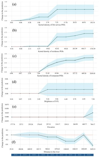 The local natural environment had a very limited impact on the population distribution, thanks to the progress of technology. Thus, the predicted population size usually remained constant (Figure 9e,f). Interestingly, there was a modest rise when the elevation increased from 449.77 to 766.17 m. Meanwhile, the confidence interval was between −0.025 and 0.075, which implied both positive and negative effects. Because of the limited training data, the prediction accuracy of the random forest model for this variable may be affected.