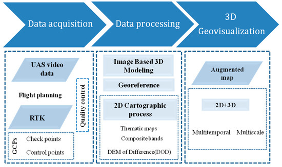 The methodology used combines the fundamentals of classic cartography, image-based 3D modeling, computer vision algorithms, and AR techniques. Figure 2 presents the three steps of the methodology [27]: (a) data acquisition, (b) data processing, and (c) 3D geovisualization implementation.