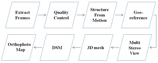 Quality control of images, resulting from frame extraction, was done visually and through the Image Quality Index of Agisoft Photoscan [28]. The images were checked individually, and were categorized as suitable or unsuitable for editing. Blurry, overloaded, or noisy images were considered unsuitable for further processing. The structure from motion algorithm was then applied to every dataset for each date and scale. The spare point cloud resulting from SfM was georeferenced by RTK measurements. In order to increase the density of the georeferenced 3D point cloud, the multi-stereo view algorithm was applied. The output was a dense point cloud, which was used to create a 3D mesh. Finally, the DSM and the orthophotomap were produced.