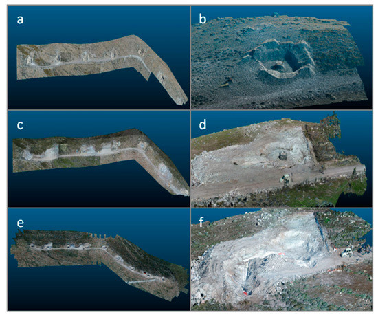 A total of five 3D georeferenced point clouds were created on the three recording dates (01 August 2018, 07 October 2018, and 11 November 2018) and at two cartographic scales: a) overall excavation area and b) trench level (site). The total root mean square error (RMSE) of the control points for the first recording date was 6.1 cm for both cartographic scales (Table 2). On the second date of recording, the RMSE was 6.4 cm for the 1:500 scale and 2.4 cm for the 1:50 scale. The total RMSE for the third date was 5.0 cm (1:500) and 4.9 (1:50). The point cloud that was created on the first recording date (01 August 2018) was from a flight height of 50 m, representing the entire study area before the excavation process began. The first 3D dense point cloud (Figure 5a) shows the six trenches, corresponding to the six locations where wind turbines were located prior to their removal. On this date, there were no findings (petrified tree trunk) in the trenches, as there was no indication of any possible petrified tracing sites. At the trench level shown in Figure 5b, the first wind turbine installation location is presented. This segment is part of the original point cloud, which was isolated and processed. The next acquisition took place when the installation project was significantly progressed. At the excavation area level, Figure 5c displays the entire excavation area, and it can be observed that some parts of the former wind turbine bases had been excavated. At the second level, on the same date (Figure 5d), a petrified tree trunk appears in the first point of installation of a new wind turbine. On the third acquisition date (11 November 2018), there are intense excavation activities at the trench level (Figure 5e). The fact that the geometry of the trench deviates from the remaining locations that were plotted on the map indicates that new findings appeared at this location. Examining the 3D dense point cloud on 11 November 2018 (Figure 5f) at the trench scale, it is observed that petrified tree trunks emerged from different levels and different directions.