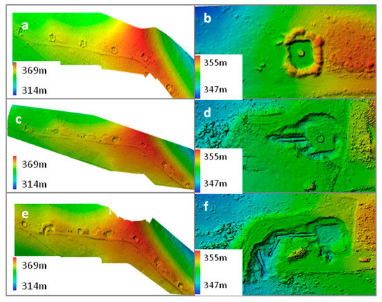 Digital surface model (DSM): of excavation area, (a) (01 August 2018), (c) (07 October 2018), (e) (11 November 2018), and of trench level (b) (01 August 2018), (d) (07 October 2018), (f) (11 November 2018).