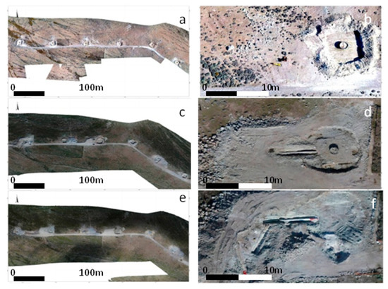 Orthophotomap of excavation area, (a) (01 August 2018), (c) (07 October 2018), (e) (11 November 2018), and of trench level (b) (01 August 2018), (d) (07 October 2018), (f) (11 November 2018).