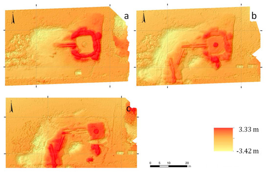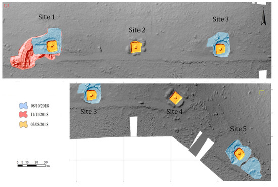 A series of maps was then created by DSM of difference (DoD). Firstly, the difference between the values in the raster cells was calculated for three different combinations, with the digital surface model corresponding to 01/08/2018 used as the reference DSM. In total, there were three subtractions: (a) one between the first and the second recording date, (b) one between the second and the third date, and (c) one between the first and the third date. The maximum positive DoD was 3.329 m and the maximum negative was 3.427 m. The DSMs that contributed to the process of subtraction and creation of digital model of difference relief had a spatial resolution of 8 cm. Finally, the above procedure was performed for both examined cartographic scales. Figure 9a illustrates the positive differences between two DSMs around windmills’ bases for the time period of August through October 2018. By executing this subtraction, a petrified tree trunk was revealed at site 1. The geometric features of the trunk were measured precisely due to the ultra-high spatial resolution of the DSM. This specific trunk has a length of 9.7 m and a width of 0.4 m, and the total surface area excavated at this site was 204 m2. Figure 9b shows the result of the second subtraction, i.e., for the time period of October through November 2018, where intense excavation activity occurred. Significant negative elevation differences can be observed at the first site and three fossil trunks are easy to detect. One trunk is 3.8 m long and its width is 0.3 m, the second one has a length of 9.6 m and a width of 0.7 m, while the length of the third is 11 m and its width is 0.6 m. The total changes that occurred during the four-month long period (August to November 2018) of excavation works appear in Figure 9c. Intensive excavation activity was observed at the first site of wind turbine installation, where a total of four petrified tree trunks appeared. The DSM, which was used as the reference model, had a spatial resolution of 8 cm, as no lower altitude flight was made on the first recording date.