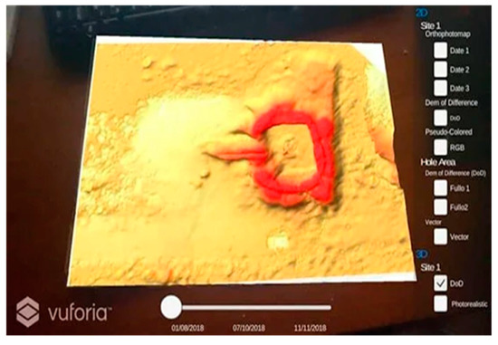The AR application developed for mobile devices can be activated without any specialized software. It provides the ability to reproduce multi-feature data and thematic information in a 3D, augmented environment. The user can specify the time period of interest in order to visualize the changes. Finally, this AR application can be used by geoheritage specialists in their fieldwork, alongside excavation monitoring and geosite management. It also helps in gathering cartographic information and transferring it anywhere, allowing it to be used at any time. It supports multiple views of the same dataset, and therefore, it can be applied at a shared workspace. In addition, the inclusion of cartographic information with the database makes it easy for a user to retrieve the desired information, using the cartographic method that best serves them, depending on the object they want to observe. The AR tool also has limitations that could be addressed in the future. Existing mobile phone technology can visually render a specific number of faces of a 3D model. This means that if a 3D model of very high spatial analysis is created, the total area of which exceeds this number, it will not be able to be visualized with this technique. In conclusion, this study provides a framework which combines UAS image-based 3D modeling and AR technology for multitemporal monitoring of the excavation process of a geoheritage site. It can be stated that UASs provide data from which spatially accurate 3D information can be generated, which can be further exploited and geovisualized by AR applications for assisting management bodies and geoscientists.