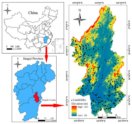 Ningdu County (26°05′~27°08′ N, 115°40′~116°17′ E) is located in the north of Ganzhou City, Jiangxi Province of China, with a total area of 4075.5 km2, as shown in Figure 1. Ningdu County is an area with hilly and mountainous terrain. The topography of Ningdu County is high in the north and low in the south, with an altitude ranging from 155~1411 m. Ningdu County is located in zone of warm temperate climate with fully humid according to Koppen’s climate classification [41], with an average rainfall of 1500~1900 mm per year from the 1970s to 2015, where there is maximum rainfall in 2002 year with annual rainfall of 2380 mm. Rainfall processes usually occur from April to July in each year. The exposed strata in the study area include Presinian, Sinian, Cambrian, Carboniferous, Jurassic, Cretaceous and Quaternary systems. The land use types are mainly forest and bare grassland. The forest coverage rate of Ningdu County is approximately 71.8%, and the natural forest area accounts for approximately 87% of the forest area. The zonal vegetation is the central Asian zone of evergreen broad-leaved forest.