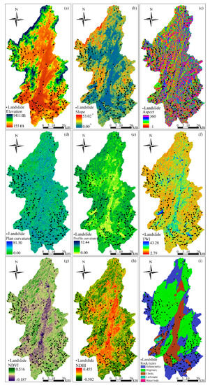 Predisposing factors under 30 m resolution: (a) elevation; (b) slope; (c) aspect; (d) plan curvature; (e) profile curvature; (f) topographic wetness index (TWI); (g) normalized difference vegetation index (NDVI); (h) normalized difference built-up index (NDBI); (i) lithology.