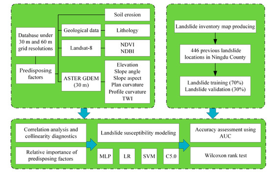 The main purpose of this study is to explore the effects of the SE factor on landslide occurrence and evaluate the importance of the SE factor in LSP modelling through comparisons of SE-based models and single models. This study has four main steps (Figure 3): (1) preparation of the model dataset, including the landslide inventory map, the 10 predisposing factors (such as SE, topography wetness index (TWI), …etc.) for SE-based models, and 9 predisposing factors for single models (such as NDVI, TWI, …etc.). In addition, this model dataset is respectively expressed with 30 m and 60 m grid resolutions; (2) correlation analysis, collinearity diagnosis and relative importance analysis of all predisposing factors; (3) the MLP, LR, SVM and C5.0 DT models are applied to carry out the LSP; (4) The AUC value is adopted to evaluate the performance of all the SE-based models and single models, and the differences in LSI before and after adding the SE factor is verified through the Wilcoxon rank test.