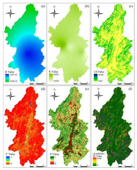 SE values and related factors with 30 m resolutions: (a) R value; (b) K value; (c) LS value; (d) C value; (e) P value; (f) SE value.