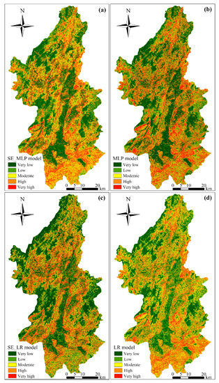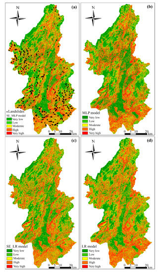 The parameters of the SE_LR model are shown in Table 3, suggesting that the SE, NDBI, slope, elevation and plan curvature factors play important roles in the processes of SE_LR model building. The LSMs are produced according to Equation (3) and are reclassified as shown in Figure 6c,d. Furthermore, the very low, low, moderate, high and very high susceptible areas respectively account for 35.31%, 19.74%, 18.61%, 15.67% and 10.67% of the total area for the SE_LR model.