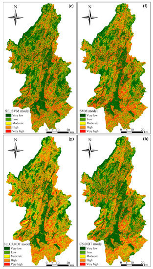 In this study, the SE_SVM and SVM models are established with the kernel function of radial basis function (RBF). The stop standard, rule parameter (C), regression accuracy and kernel parameter (γ) of both models are 10−3, 9, 0.1 and 0.6, respectively. These trained models are used to predict the LSIs of all grid units (Figure 5e,f). The very high, high, moderate, low and very low areas, respectively, account for 20.15%, 14.43%, 13.57%, 22.67% and 29.18% of the total area for the SE_SVM model. The trained C5.0 DT model is used to obtain the LSIs of the study area and produces LSMs (Figure 5g,h). The very high, high, moderate, low and very low areas respectively account for 14.34%, 16.55%, 16.80%, 22.67% and 32.94% of the total area for the SE_C5.0 DT model.