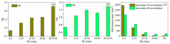FR values between SE and landslides with resolutions of 30 m (a), 60 m (b) and areas distribution (c) 5.2. Importance Analysis of Soil Erosion in LSP.